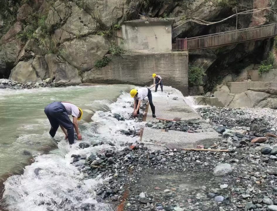連日驟減的來水量迫使天彭電力鳳鳴湖水庫水位只能保持在低位運(yùn)行。此刻,對(duì)保供者來說,每一滴來水都彌足珍貴,而做好引水工作就成為了保障發(fā)電生產(chǎn)和城區(qū)供水的重中之重。天彭電力上下聯(lián)動(dòng),全員作戰(zhàn),沙金車間、鳳鳴橋車間一線堅(jiān)守責(zé)任到崗、迅速行動(dòng),頂著烈日清理底格欄柵壩壩面砂石、庫區(qū)進(jìn)水閘浮渣和前池淤積物,嚴(yán)格執(zhí)行“每日一小撈、三日一大撈、洪水天天撈”制度,做到多引水和保水源“兩手抓、兩手硬”,從源頭上守住保水保電的“生命線”。