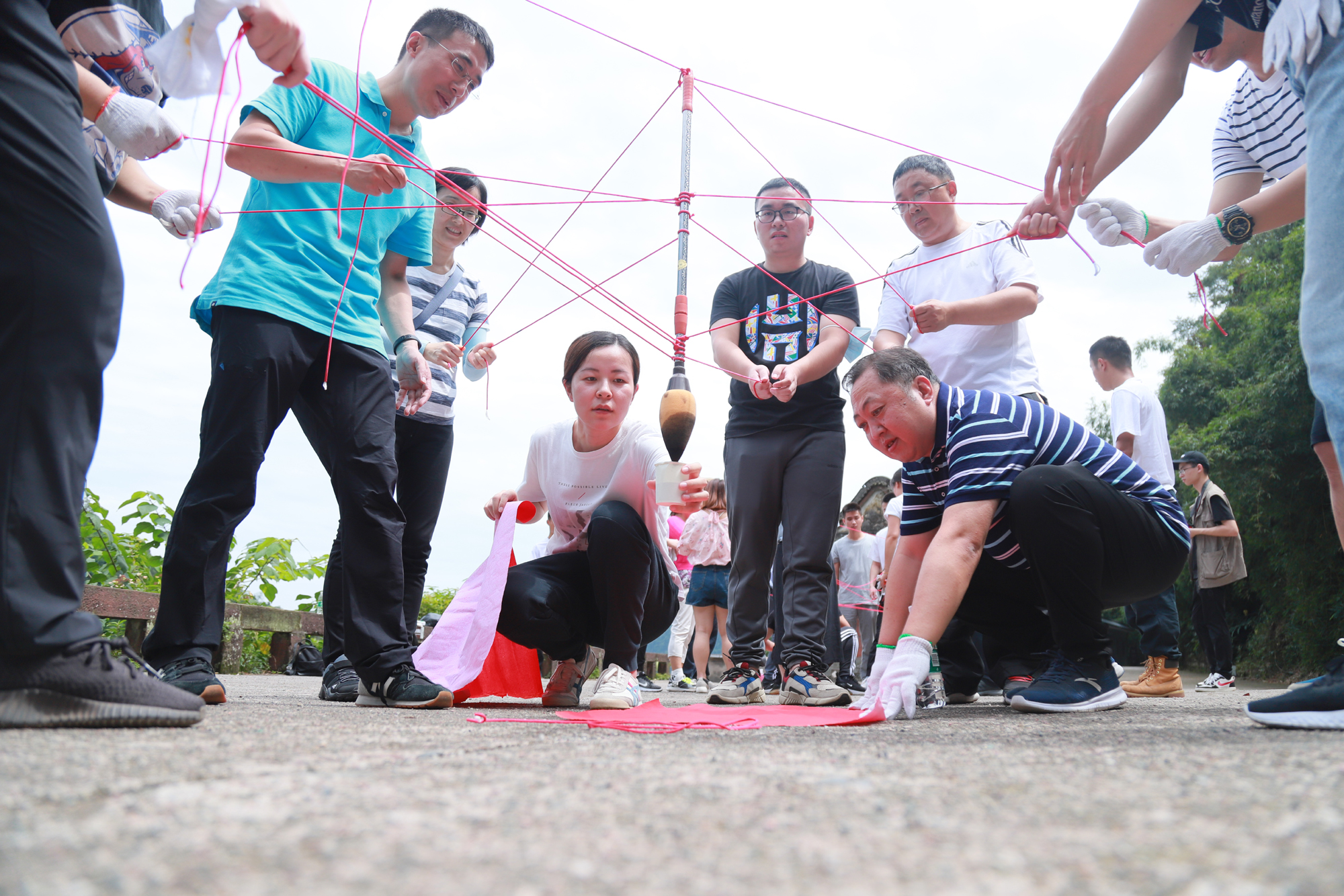 “人心齊,泰山移”。在“書寫傳奇”環(huán)節(jié),小組每個成員拉住綁有大毛筆的繩子末端,通力協(xié)作配合完成指定書寫文字,深刻啟發(fā)大家在工作中不僅要做好崗位工作,恪盡職守,還有學(xué)會合理分工,靈活變通,營造互幫互助、唇亡齒寒的全局觀念,為了團隊目標最終達成及時協(xié)作調(diào)整、鍥而不舍。“流血流汗不流淚,掉皮掉肉不掉隊”。在“飛奪瀘定橋”環(huán)節(jié),教練給各組分發(fā)隊員人數(shù)一半的泡沫墊,要求從起點出發(fā),借助泡沫墊且腳不觸地的情況下,全組隊員“一個都不能少”全數(shù)到達終點。各小組以斷金碎石的精神,堅定信念,持續(xù)超越;在無障礙溝通的氛圍中感受眾人合力,不斷突破,熔煉團隊。