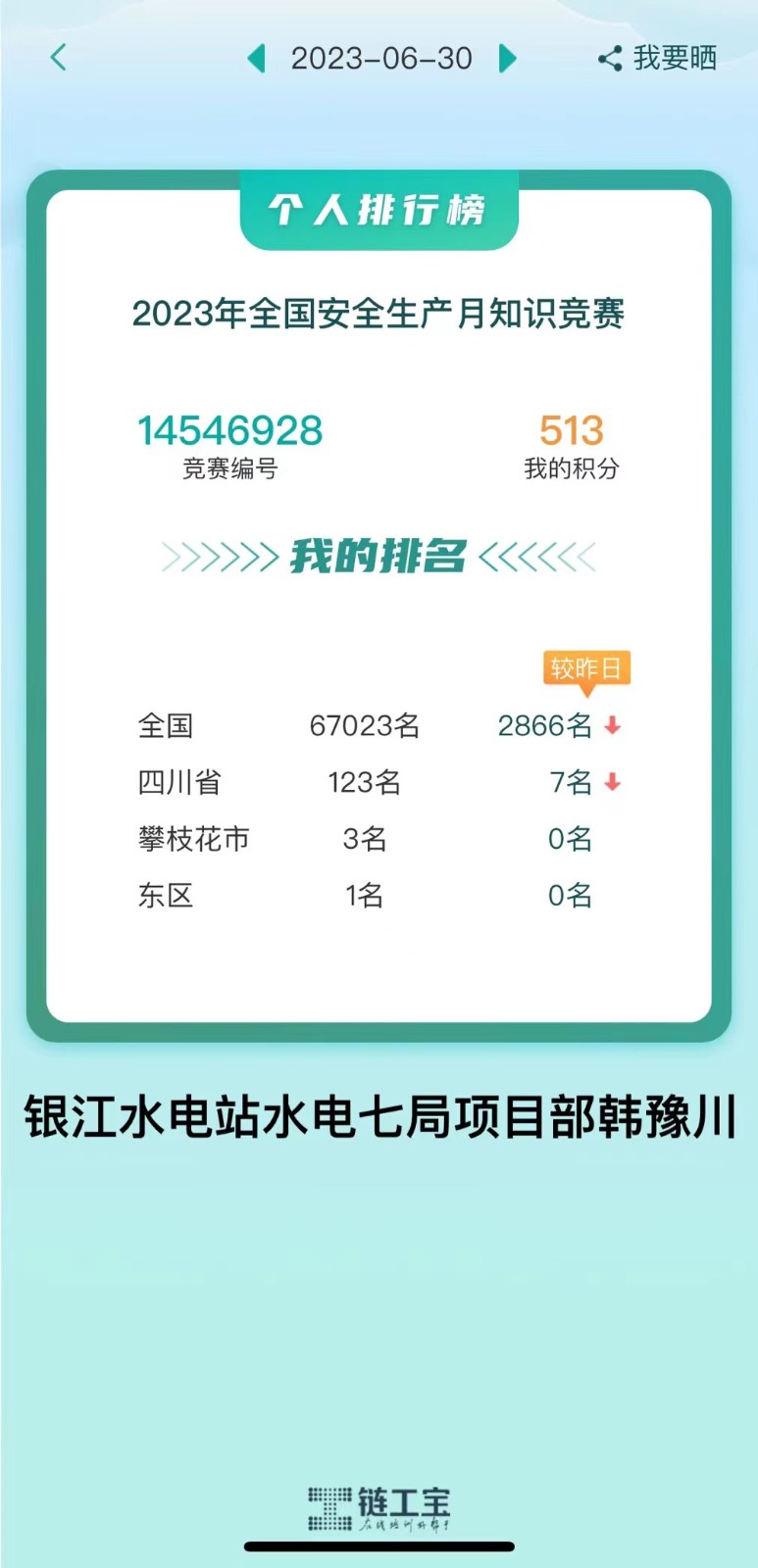 在“鏈工寶”2023年全國安全生產(chǎn)月知識競賽活動中,攀枝花市前10名中,銀江水電站占3人,東區(qū)前10名中,銀江水電站占6人,有效檢驗了安全生產(chǎn)月活動成果,充分體現(xiàn)了銀江水電站學(xué)安全、講安全的濃厚安全生產(chǎn)氛圍,進一步強化了廣大工程參建人員的安全生產(chǎn)意識。