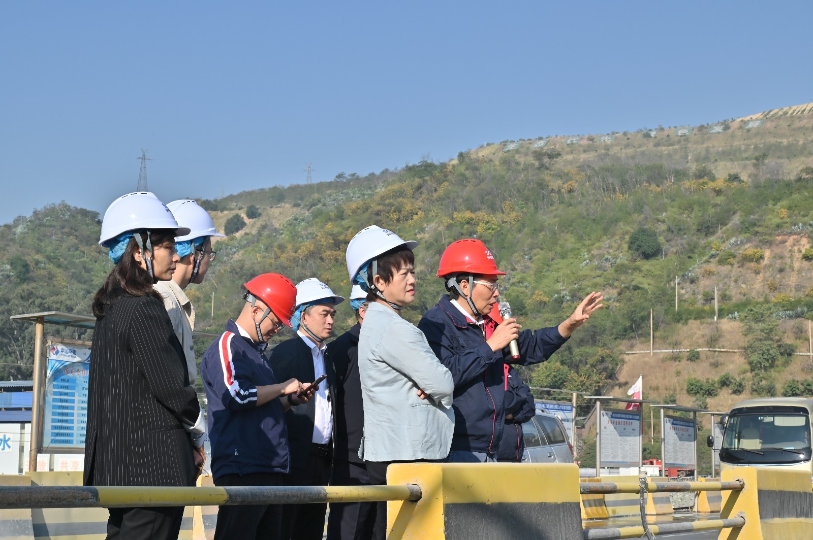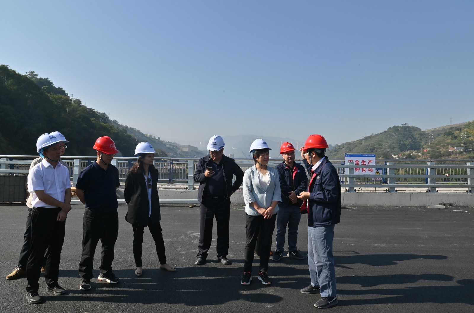 鄭世紅一行直奔銀江水電站施工現(xiàn)場,在施工變電站聽取了銀江水電站工程進展情況、安全環(huán)保工作情況、投資完成情況等匯報,然后深入大壩基坑施工和設(shè)備安裝現(xiàn)場、銀江大橋進行檢查指導,重點檢查了銀江水電站大壩廠房混凝土澆筑、機組管型座安裝、銀江大橋橋面施工等具體施工情況。