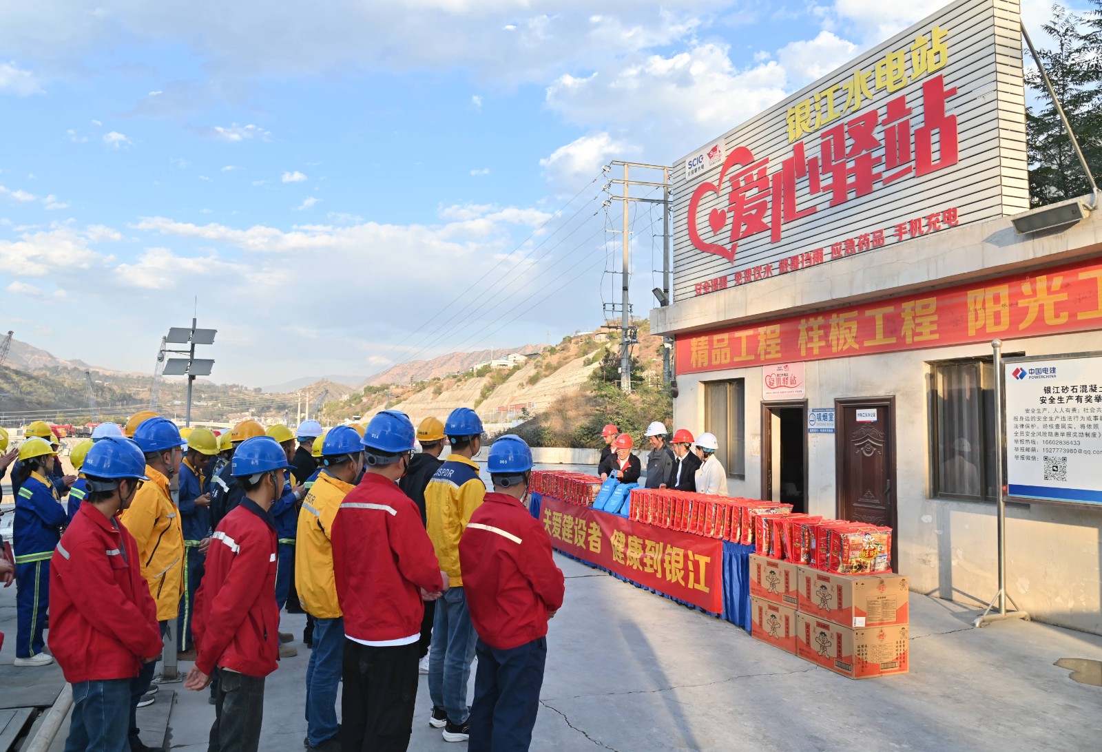 活動首先參觀了公司大黨建宣傳陣地和銀江水電站施工現(xiàn)場。在愛心驛站,黨員們?yōu)閬碜蚤L江設計院、貴陽院監(jiān)理部、水電五局項目部、水電七局項目部、廣東源天項目部等參建單位的工友發(fā)放了健康宣傳手冊、新春大禮包等慰問物品。田巨龍感慨到銀江水電站工程建設速度之快難以令人想象,囑咐工友們一定要保重身體、注意自身防護,祝福工友們平平安安、健健康康迎接新年的到來。