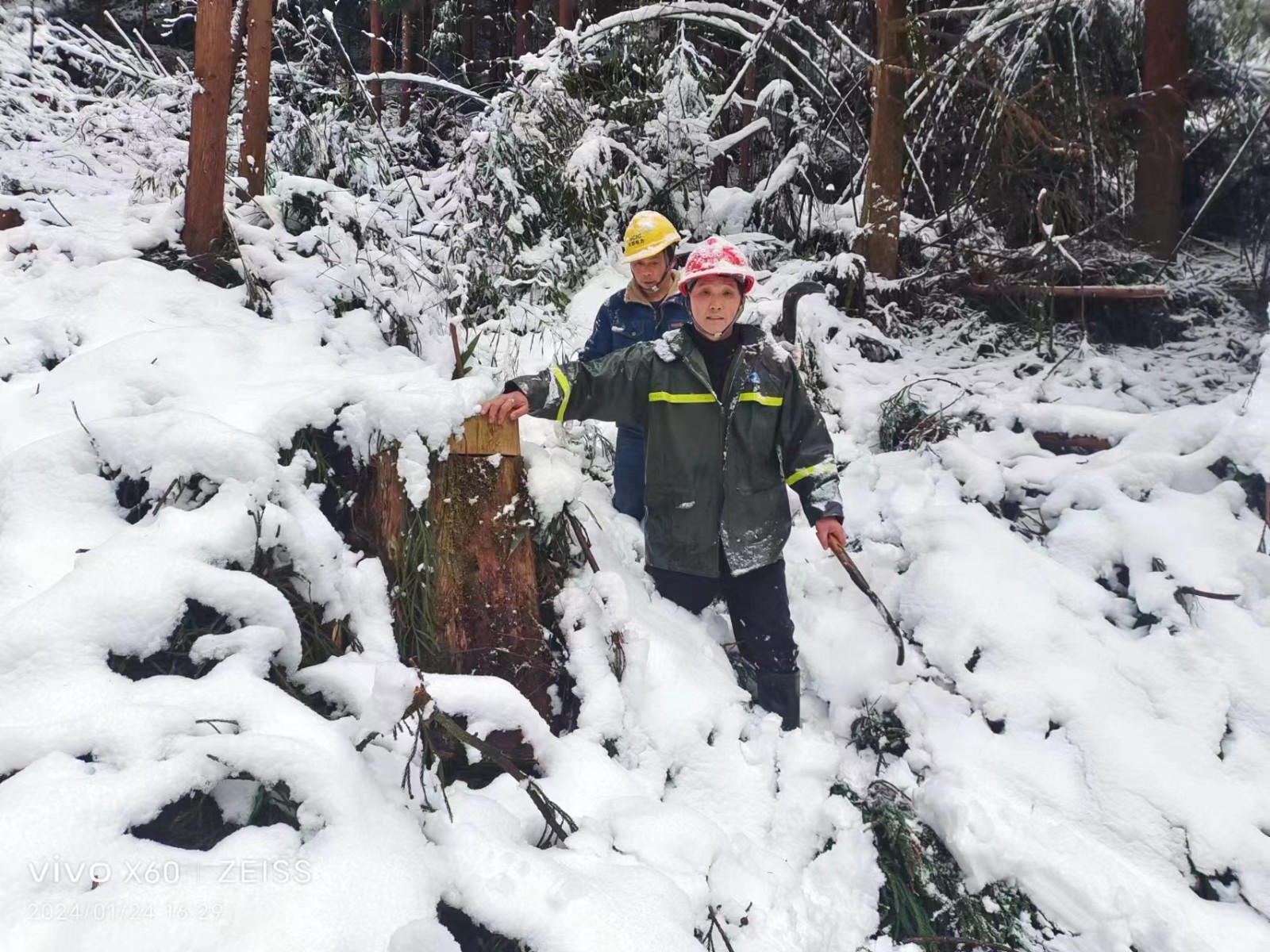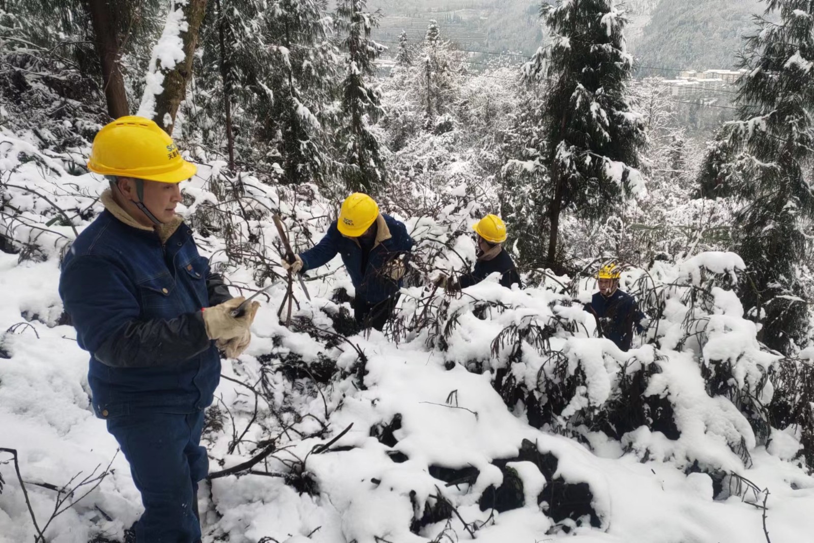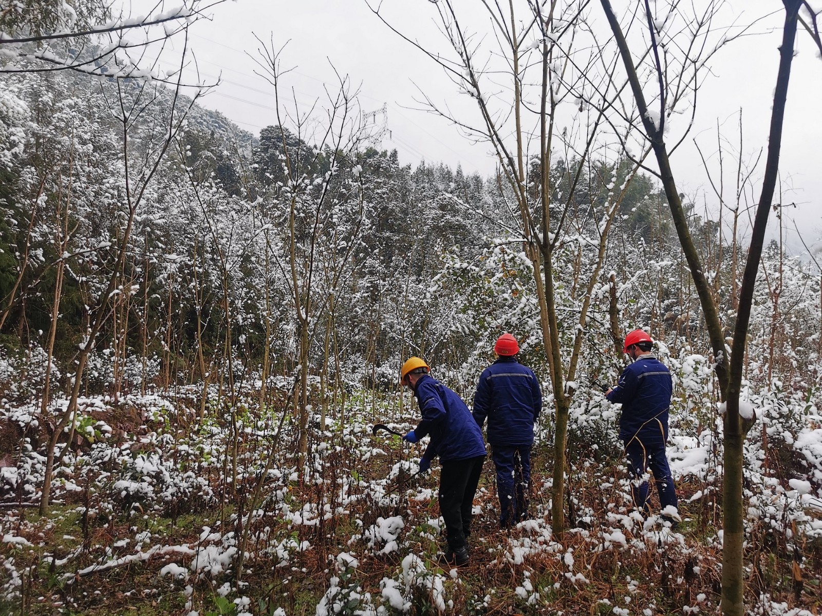 1月23日,天彭電力制定詳細(xì)的樹障清理計劃。巡線員手持砍刀,翻山越嶺,負(fù)重前行,踩著嘎吱作響的積雪,迎著刀割般的寒風(fēng),迅速開始對110kV鳳回線、10kV沙橋線、鳳通線等線路設(shè)備進(jìn)行巡查,對倒伏在線路的竹樹進(jìn)行“圍剿”,共清理樹枝、竹子共110余棵,現(xiàn)場巡線員盡管臉凍得通紅、手凍得僵硬、腳凍得麻木,仍有條不紊地開展工作,經(jīng)過一天的辛勤巡檢,線路和設(shè)備均運行正常。