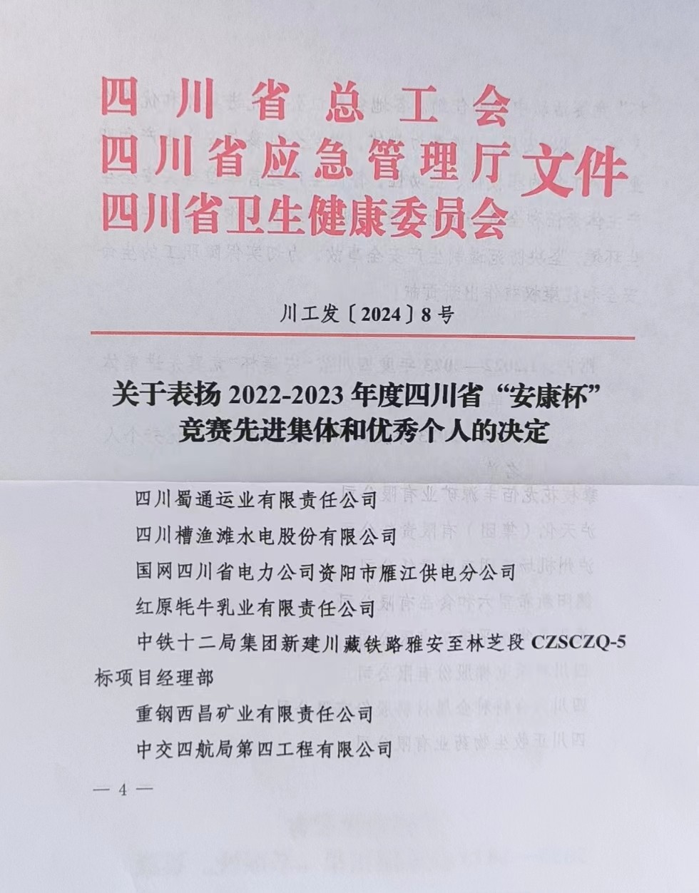 近日,四川省總工會、四川省應(yīng)急管理廳、四川省衛(wèi)生健康委員會聯(lián)合印發(fā)《關(guān)于表彰2022-2023年度四川省“安康杯”競賽先進(jìn)集體和優(yōu)秀個人的決定》,四川槽漁灘水電股份有限公司(簡稱“槽漁灘公司”)榮獲四川省“安康杯”競賽優(yōu)勝單位榮譽稱號。