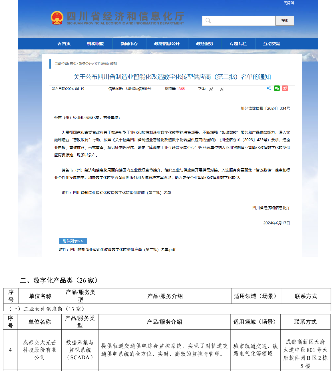 2024年6月19日,四川省經(jīng)濟和信息化廳網(wǎng)站公布四川省制造業(yè)智能化改造數(shù)字化轉型供應商(第二批)名單,交大光芒作為數(shù)字化產(chǎn)品類工業(yè)軟件供應商入選四川省制造業(yè)智能化改造數(shù)字化轉型供應商資源池。