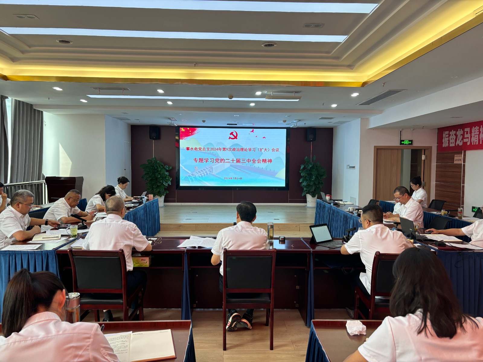 7月24日,攀水電公司黨總支召開(kāi)2024年第9次政治理論學(xué)習(xí)(擴(kuò)大)會(huì)議,專題傳達(dá)學(xué)習(xí)黨的二十屆三中全會(huì)精神,會(huì)議由川投能源副總經(jīng)理、攀水電公司黨總支書記、董事長(zhǎng)徐孝剛主持,公司黨總支政治理論學(xué)習(xí)會(huì)成員、全體中干、支部書記、其他黨員、統(tǒng)戰(zhàn)對(duì)象、入黨積極分子共計(jì)30余人參加學(xué)習(xí)。