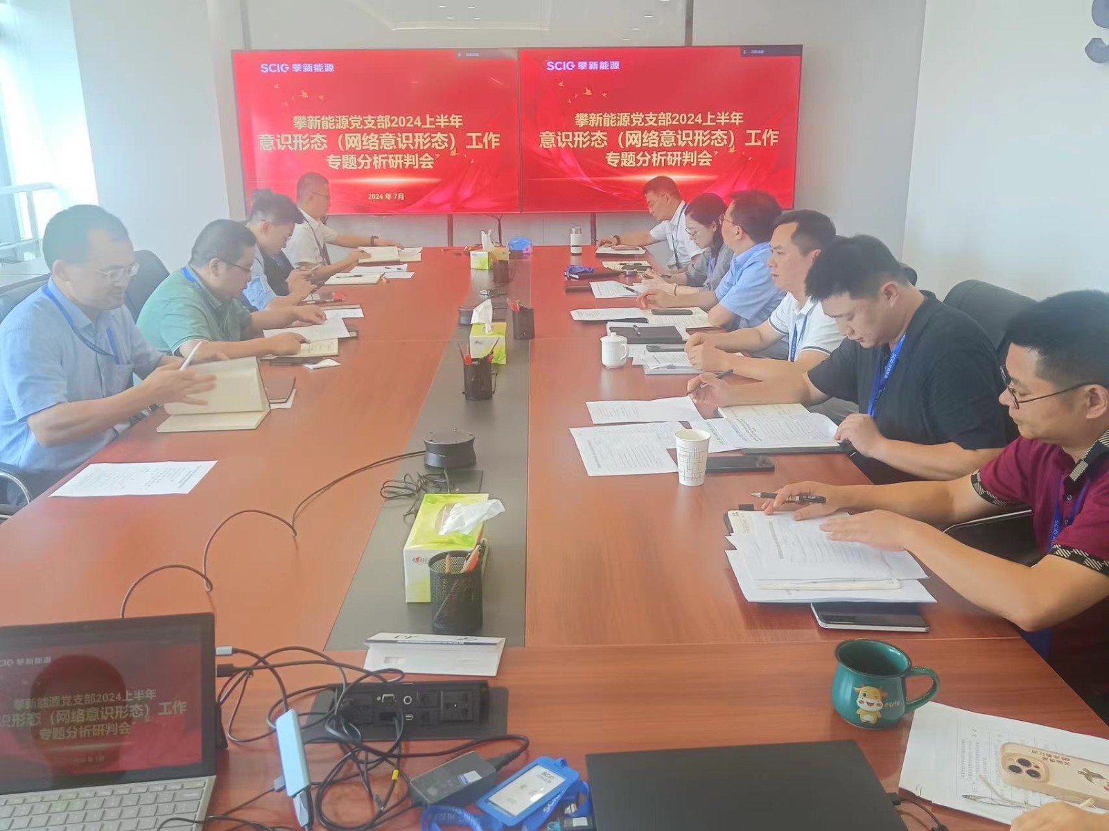 7月29日,攀新能源公司黨支部召開2024年上半年意識形態(tài)(網(wǎng)絡(luò)意識形態(tài))工作專題分析研判會,公司黨委書記、董事長王行仁主持會議,全體支部黨員參加會議。