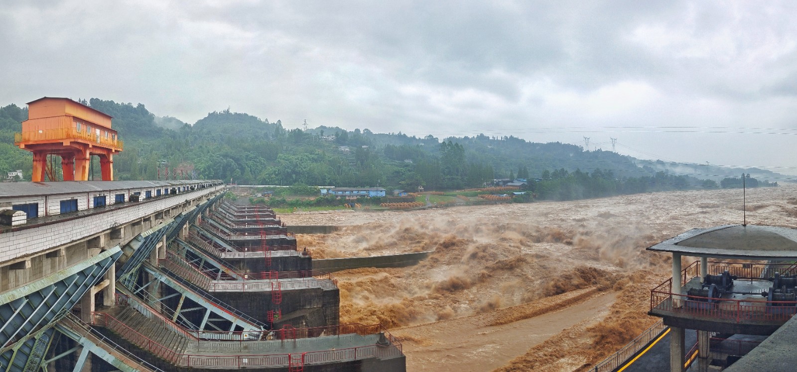 上游來(lái)水持續(xù)增大,7時(shí)10分,槽漁灘電廠的入庫(kù)流量達(dá)到9320 m3/s,電廠啟動(dòng)Ⅳ級(jí)應(yīng)急響應(yīng)。情況緊急,電廠職工一邊拉響警報(bào),提醒下游群眾及時(shí)撤離危險(xiǎn)區(qū),一邊組織現(xiàn)場(chǎng)巡查勸導(dǎo);檢修車間將1-9號(hào)泄洪閘門(mén)保持全開(kāi)狀態(tài),值班員熊勇剛、陳利強(qiáng)迅速到崗到位,按操作程序安全提起9道閘門(mén),并手動(dòng)將閘門(mén)高度從9.5米提升至10.5米。