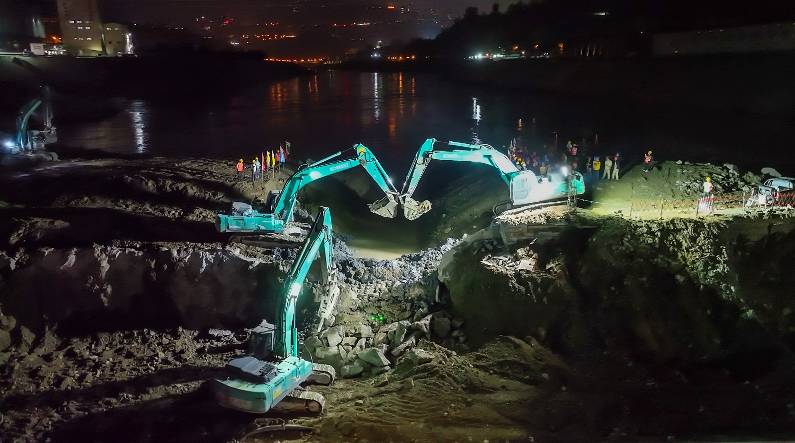 金秋十月,川投能源銀江水電站工程建設“進度條”持續(xù)刷新。10月25日晚上,隨著川投能源副總經(jīng)理、導流明渠截流指揮長徐孝剛一聲令下,十余臺挖掘機在二期上游圍堰右岸進行破口開挖,奔騰的金沙江水隨即涌入主河床廠房與溢流壩上游,充水平壓后江水經(jīng)溢流壩段流向下游,銀江水電站成功實現(xiàn)分流。這一重要進展為按期完成導流明渠截流打下堅實基礎,也標志著銀江水電站首臺機組投產(chǎn)發(fā)電正式進入倒計時階段。
