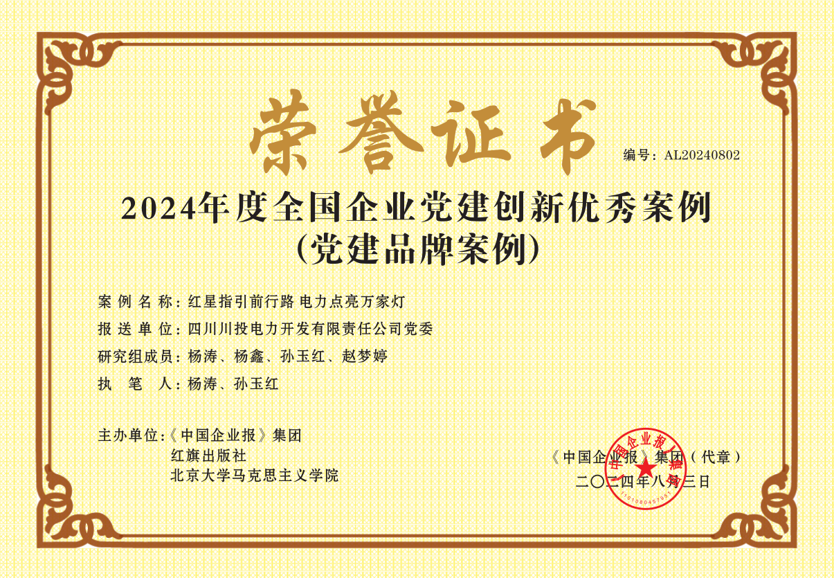近日,中企黨建研究院微信公眾號以《四川川投電力開發(fā)有限責(zé)任公司黨委:紅星指引前行路電力點(diǎn)亮萬家燈》為題,報(bào)道川投電力黨委打造“星引力”黨建品牌賦能企業(yè)發(fā)展相關(guān)經(jīng)驗(yàn)做法,同時,該案例入選紅旗出版社《全國企業(yè)黨建創(chuàng)新優(yōu)秀案例選集(2024年度)》。
