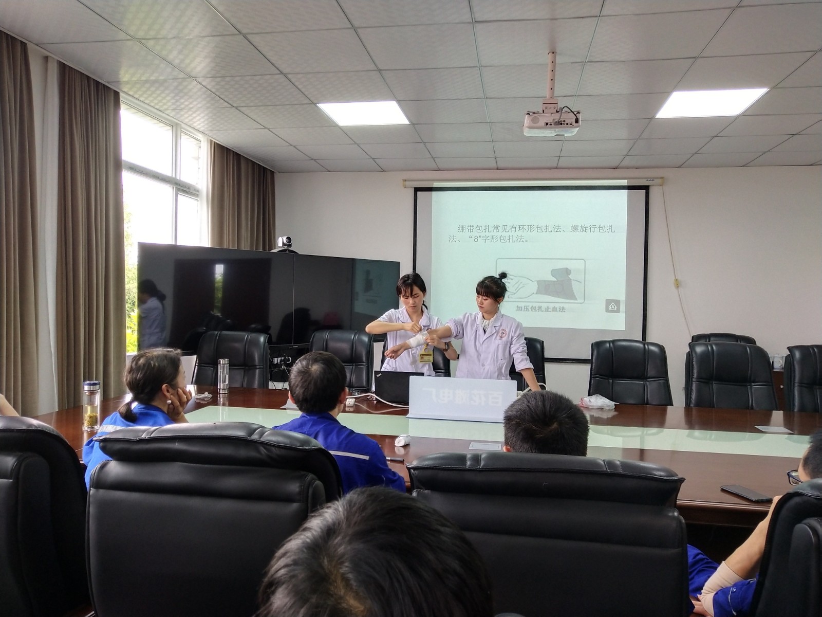 培訓(xùn)老師結(jié)合多年的臨床經(jīng)驗(yàn)及電站工作特點(diǎn),通過播放幻燈片和視頻、展示實(shí)物、現(xiàn)場(chǎng)演示等形式,以近年來(lái)發(fā)生在身邊的鮮活事例,向?qū)W員們強(qiáng)調(diào)了應(yīng)急救護(hù)“黃金四分鐘”的重要性,隨后逐一講解了胸外按壓、人工呼吸、止血、包扎、骨折固定、傷員搬運(yùn)等急救理論與施救技巧,并現(xiàn)場(chǎng)實(shí)操心肺復(fù)蘇、繃帶、三角巾包扎等方法,教會(huì)工人遇到意外傷害時(shí)如何就地取材進(jìn)行初步應(yīng)急處理,同時(shí)還與電站員工現(xiàn)場(chǎng)互動(dòng),手把手的傳授相關(guān)操作技能,以確保學(xué)員能夠充分掌握并正確運(yùn)用。