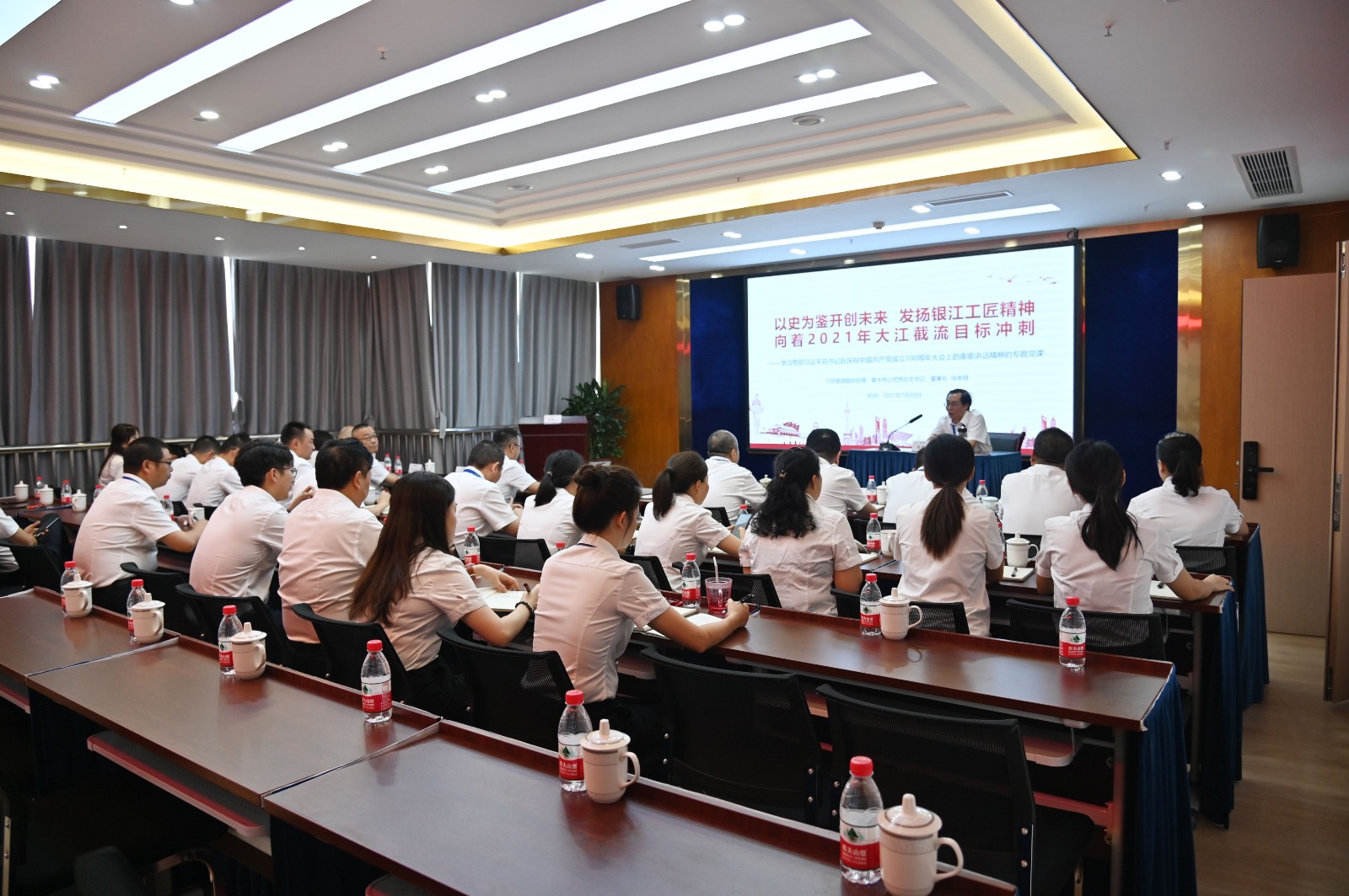 簽約儀式后,川投能源副總經(jīng)理、公司黨總支書記、董事長徐孝剛做了題為《以史為鑒開創(chuàng)未來,發(fā)揚(yáng)銀江工匠精神,向著2021年大江截流目標(biāo)沖刺》的專題黨課,帶領(lǐng)大家學(xué)習(xí)貫徹習(xí)近平總書記在慶祝中國共產(chǎn)黨成立100周年大會(huì)上重要講話精神。他表示,距離大江截流的倒計(jì)時(shí)越來越近,本次“師帶徒”簽約儀式,一是深入領(lǐng)會(huì)習(xí)近平總書記的重要講話精神,從黨史中汲取推動(dòng)工程建設(shè)和公司高質(zhì)量發(fā)展的強(qiáng)大動(dòng)力;二是傳承工匠精神,培育銀江工匠文化,激勵(lì)全體銀江建設(shè)者朝著既定目標(biāo)前進(jìn),向著大江截流沖刺;三是廣泛培養(yǎng)銀江建設(shè)者的創(chuàng)新意識(shí),建設(shè)知識(shí)型、技能型、創(chuàng)新型水電建設(shè)大軍,最大程度激發(fā)各參建單位的創(chuàng)新才能。