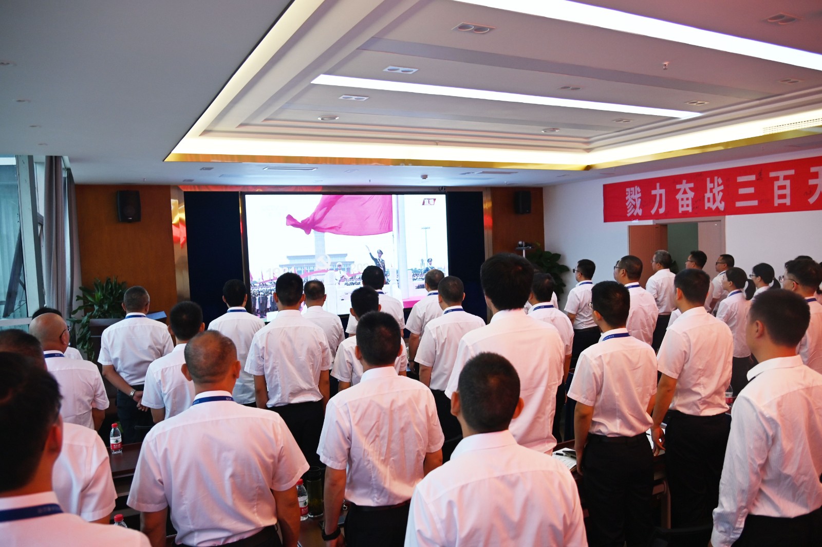 視頻中,習(xí)近平總書記鏗鏘有力的聲音深入人心,從1921到2021,中國共產(chǎn)黨帶領(lǐng)中國人民,從風(fēng)雨飄搖中一路走來,百年征程波瀾壯闊,百年初心歷久彌堅。當(dāng)《國歌》《國際歌》相繼響起的時刻,會場人員紛紛起立,跟隨激昂的旋律整齊高唱。當(dāng)回顧“四史”贊頌黨的偉業(yè)之時,會場人員滿溢出對黨的感恩和身為黨員的自豪。